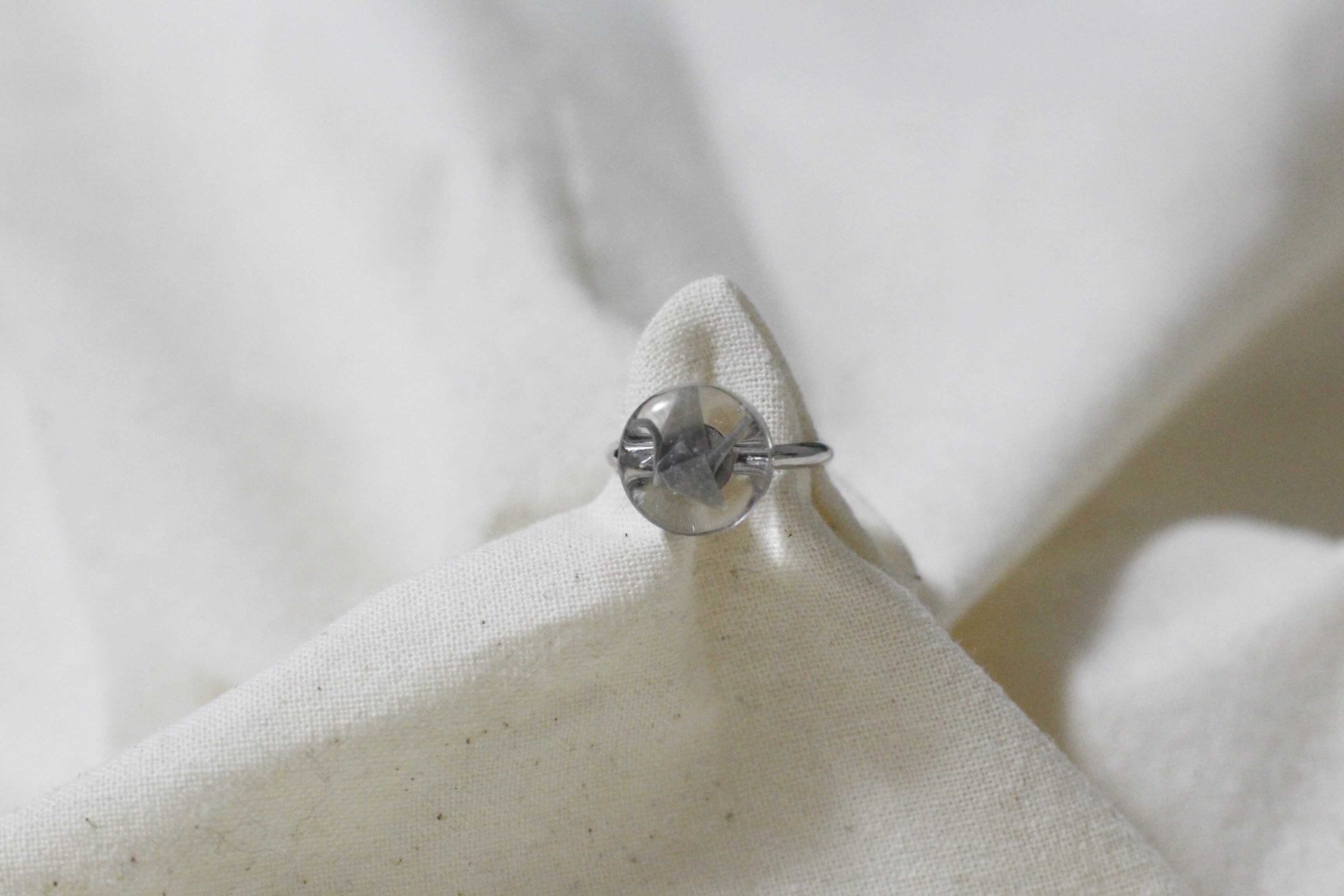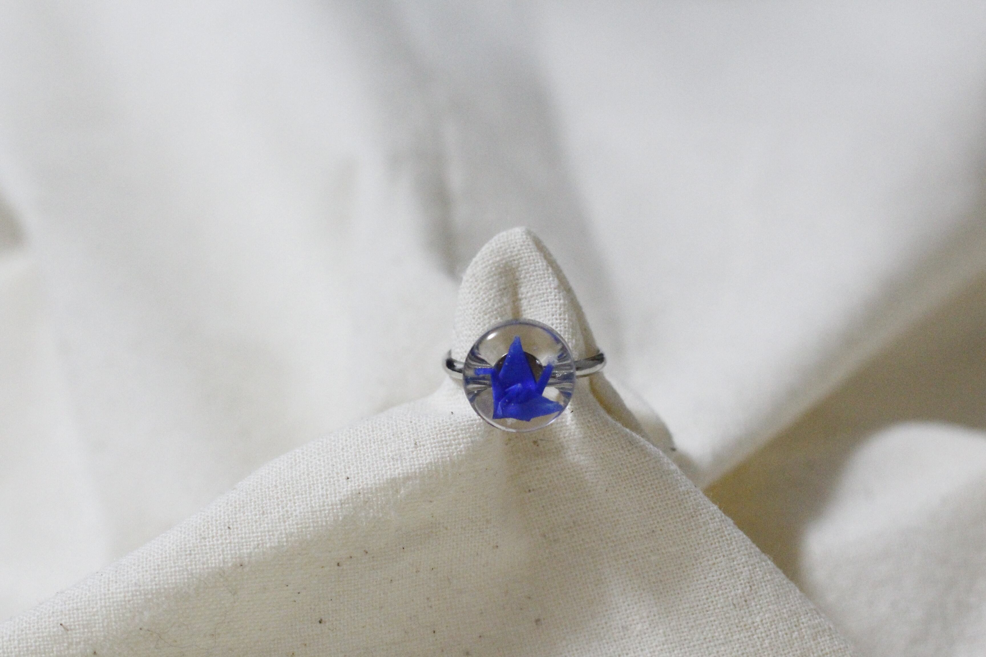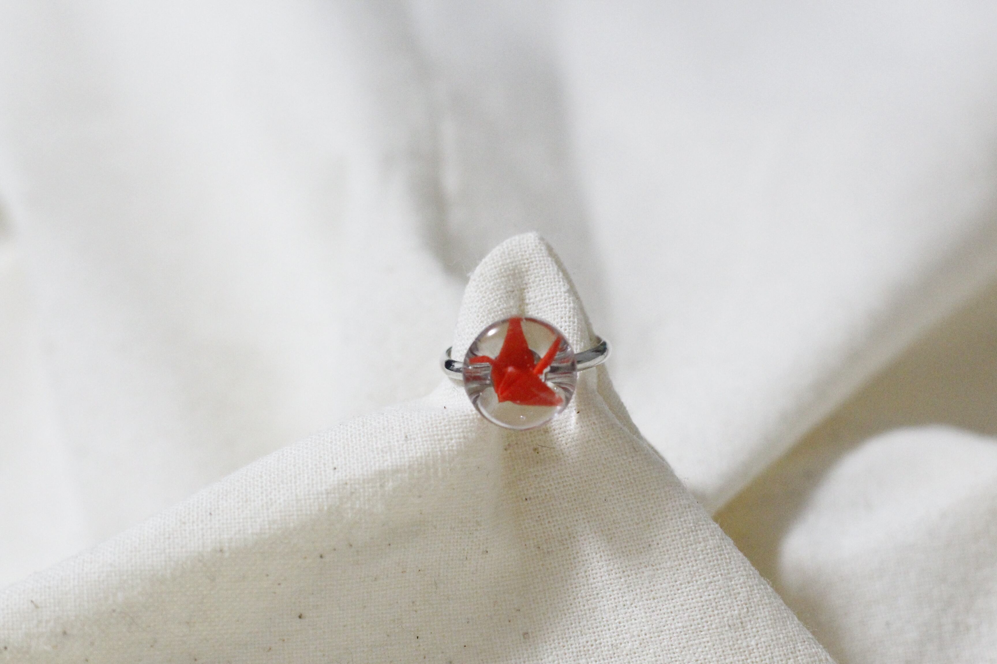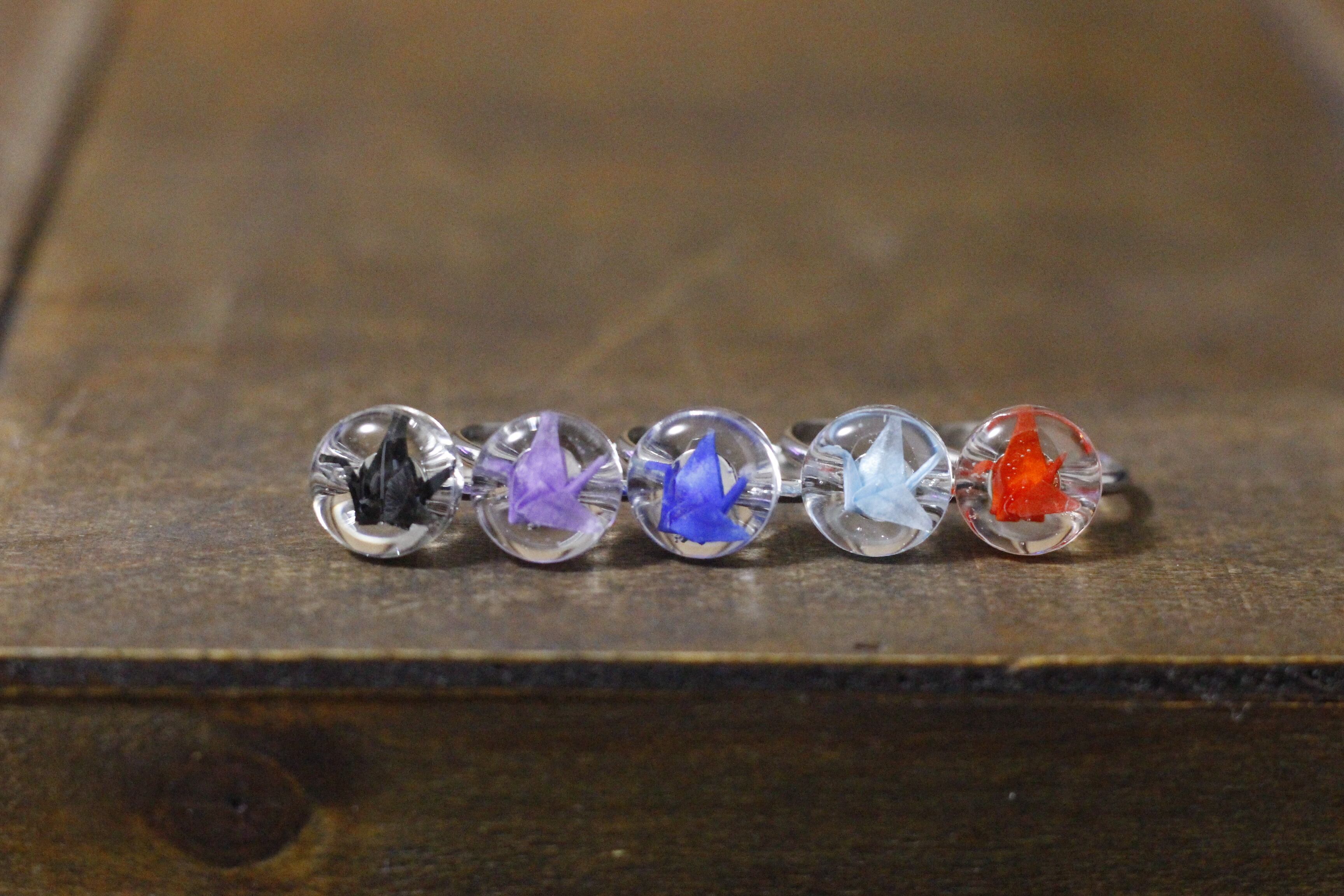 1センチ程の折り鶴を一つ一つピンセットで折りレジンで閉じ込めたリングになります♡